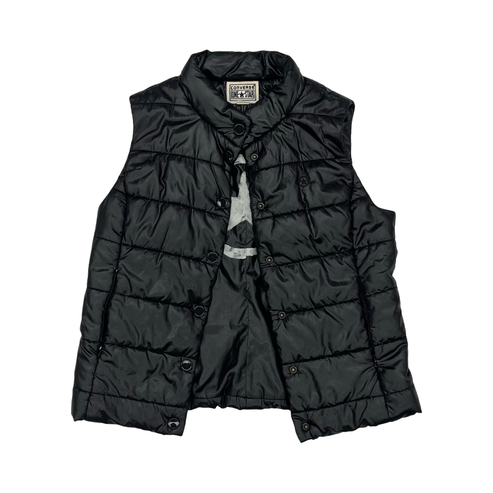 Immerse in warmth and style with the Converse Black Puffer Vest in Size M. Crafted for comfort, this sleek piece exudes sophistication and versatility for any occasion.